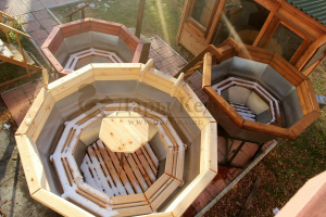 Банный чан с ветрозащитой изготовлен из пищевой стали. Представляет собой большую ёмкость в виде чаши, при нагревании которой можно париться на свежем воздухе. Банный чан установлен на металлическую закрытую подставку, которая служит защитой от ветра и печью одновременно. В комплект такой модели входит дымоход 2 метра. Чан оборудован кедровым бортом, скамейками, подспинниками, трапом для ног и приставной лестницей.