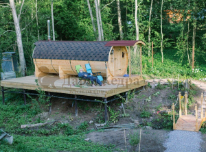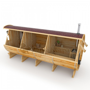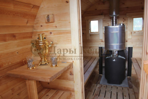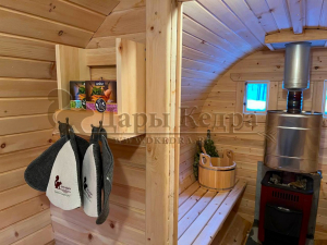 Это изделие круглой вытянутой формы с тремя отделениями: раздевалкой, моечной и парной. Во всех трех отделениях с обеих сторон установлены лавочки из кедра. Печь находится в парилке около дальней стены. Для удобства пользования в бане висят полочки из кедра и вешалка в раздевалке. Время растопки такой бани не превышает 30 минут. По вашему желанию баню-бочку можно дополнить печью с внешней загрузкой, благодаря которой весь мусор после топки останется на улице. Круглая баня-бочка не требует полноценный фундамент, поэтому при необходимости ее можно перенести в другое место.