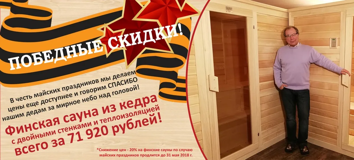 В честь майских праздников мы делаем цены на финские сауны еще доступнее и говорим СПАСИБО нашим дедам за мирное небо над головой!