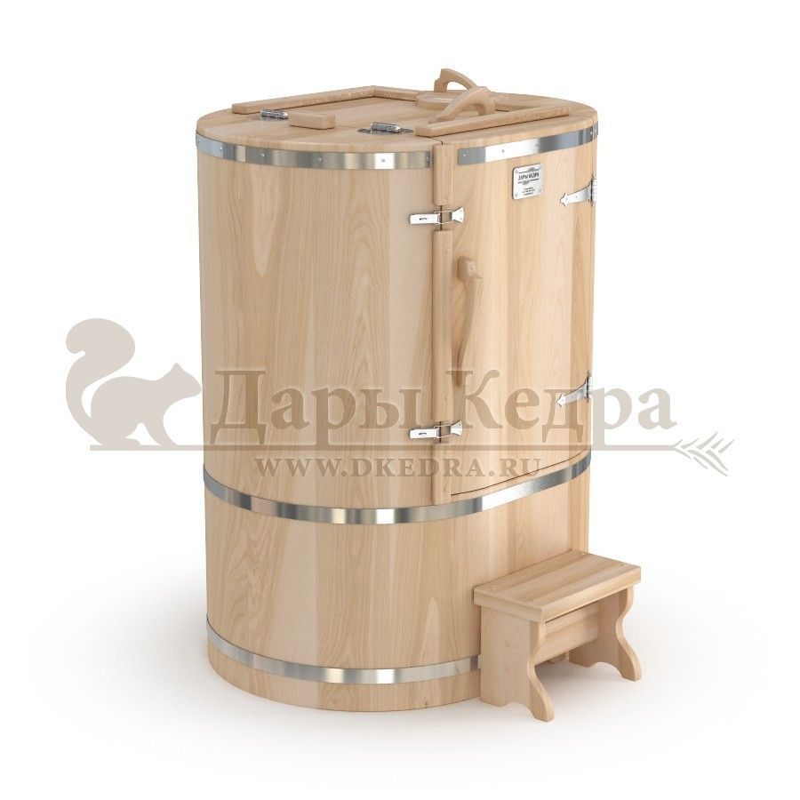 Кедровая бочка (фитобочка) овальная «Классическая» Овальная фитобочка из кедра - это мини парная, которую можно использовать не только в спа-салонах, но и дома. Овальная модель более просторна и удобна в использовании. Толщина стенок составляет 25 мм. Она оборудована откидными створками, дверцей и отверстием для головы. Во время парения человек сидит внутри кедровой бочки, а голова находится снаружи. Благодаря этому исключается возможность перегрева. Подлокотники из кедра, встроенные ручки на створках и двери делают эксплуатацию более удобной. Парение в фитобочке благотворно влияет на организм в целом: повышается иммунитет, выводятся шлаки и токсины, улучшается работа органов тела и состояние кожи.