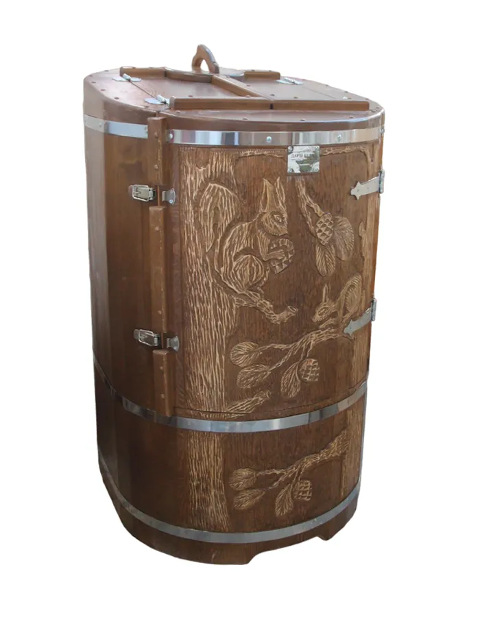Кедровая бочка (фитобочка) «Сибирская белка» Любая модель эксклюзивной фитобочки - это выбор не только дизайнеров и ценителей красоты, но и тех, кто любит нестандартный подход в любых деталях. С оригинальной авторской фитобочкой Дары Кедра ваша квартира, дом или салон красоты станут объектом всеобщего внимания, ведь такая фитобочка - это не просто смело, красиво и достойно, это еще и очень полезно для Вашего здоровья! Художественная резьба это ручная работа, выполняется разными мастерами и каждый рисунок неповторим. Вы можете выбрать предложенные варианты резьбы или подобрать изображение и мы предложим вам подходящий эскиз. На сайте представлены наши работы в качестве примера. Каждая резьба рассчитывается индивидуально и может быть нанесена на любую модель фитобочки. Эксклюзивная фитобочка может быть представлена в разной цветовой гамме: После того, как цвет фитобочки выбран, необходимо определиться с вариантом резьбы (или предложить свой): Фитобочку можно также декорировать канатной веревкой в места обручей из нержавеющей стали (оплачивается дополнительно).