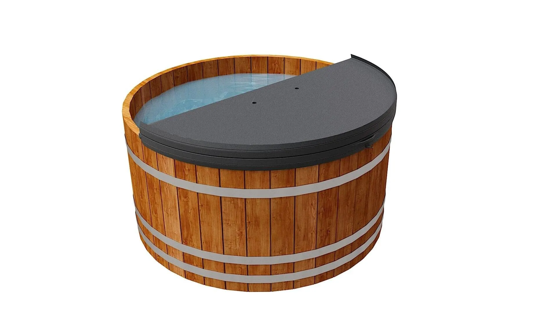 Это купель с круглой внутренней чашей, которая изготовлена из современного прочного и термоустойчивого материала (композита). Форма чаши обеспечивает комфортную посадку внутри изделия. Для удобного использования купель оснащена приставной лестницей. Обручи из нержавеющей стали декорируют купель с композитом и равномерно распределяют нагрузку во время процедур.