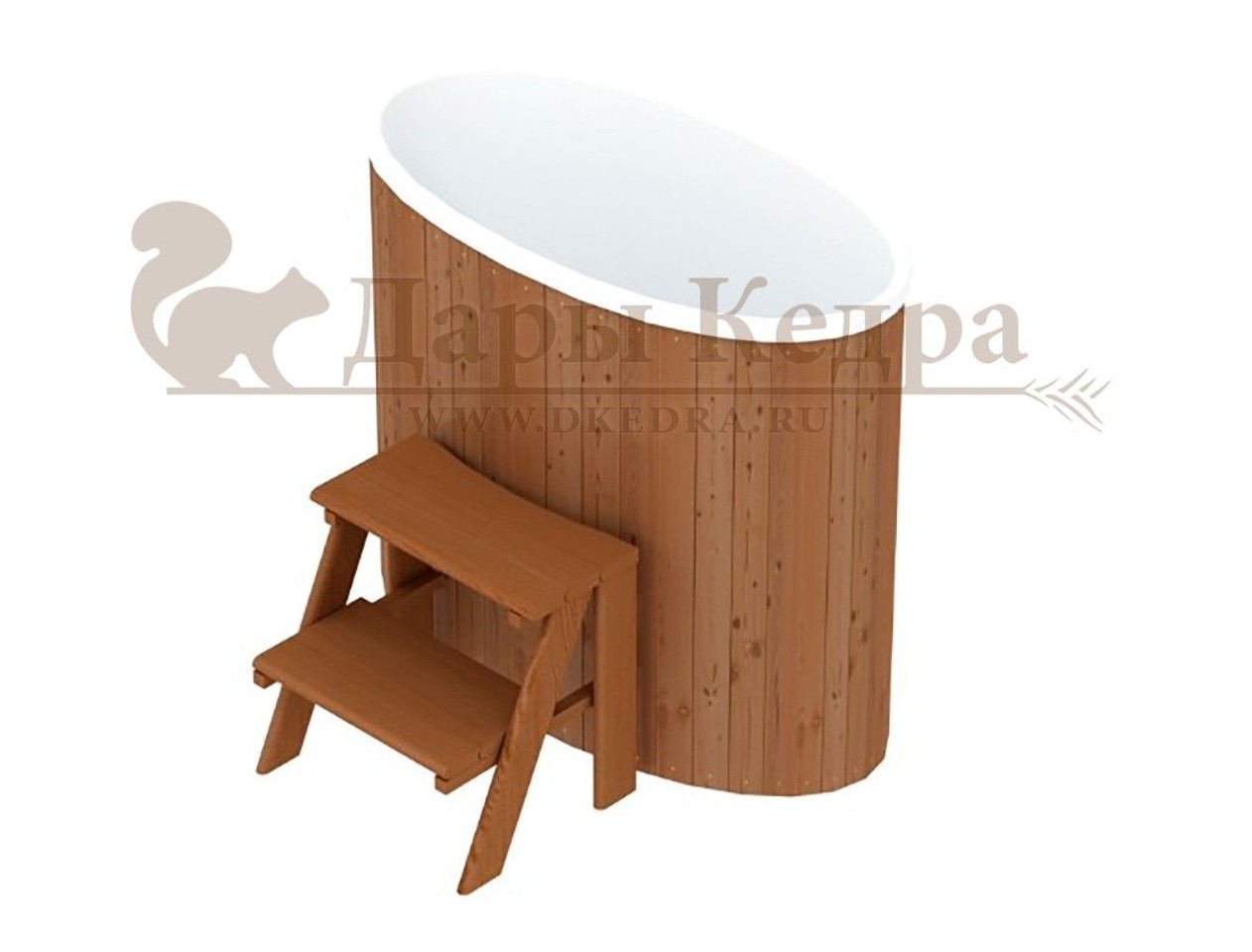 Это купель с внутренней овальной чашей, которая изготовлена из современного прочного и термоустойчивого материала (композита). Форма чаши обеспечивает комфортную посадку внутри изделия. Для удобного использования купель оснащена приставной лестницей. Обручи из нержавеющей стали декорируют купель с композитом и равномерно распределяют нагрузку во время процедур.